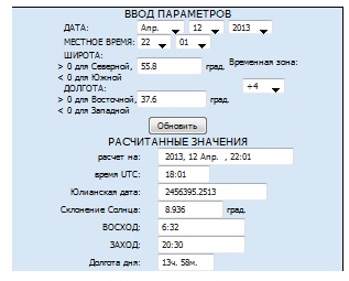 Астрономический калькулятор - Расчет угла склонения и длительности светового дня