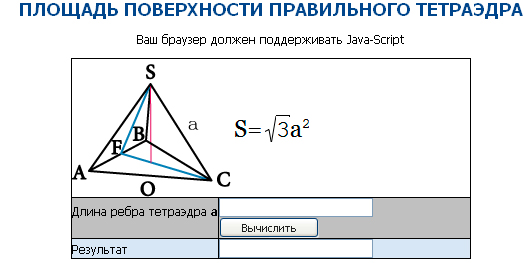 Тетраэдром в стереометрии называется многогранник, который состоит из четырёх треугольных граней. Тетраэдр имеет 6 рёбер и по 4 грани и вершины. Если у тетраэдра все грани являются правильными треугольниками, то и сам тетраэдр называется правильным. Площадь полной поверхности любого многогранника, в том числе и тетраэдра можно рассчитать, зная площади его граней. Чтобы найти площадь полной поверхности тетраэдра, необходимо вычислить площадь треугольника составляющего его грань. Если треугольник равносторонний, то его площадь равна S = √3 * 4 / a², где a – ребро тетраэдра, тогда площадь поверхности тетраэдра находится по формуле S = √3 * a². >>