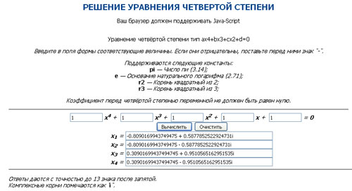 Приведен калькулятор для решения уравнения четвертой степени типа ax4+bx3+cx2+d=0 >>
